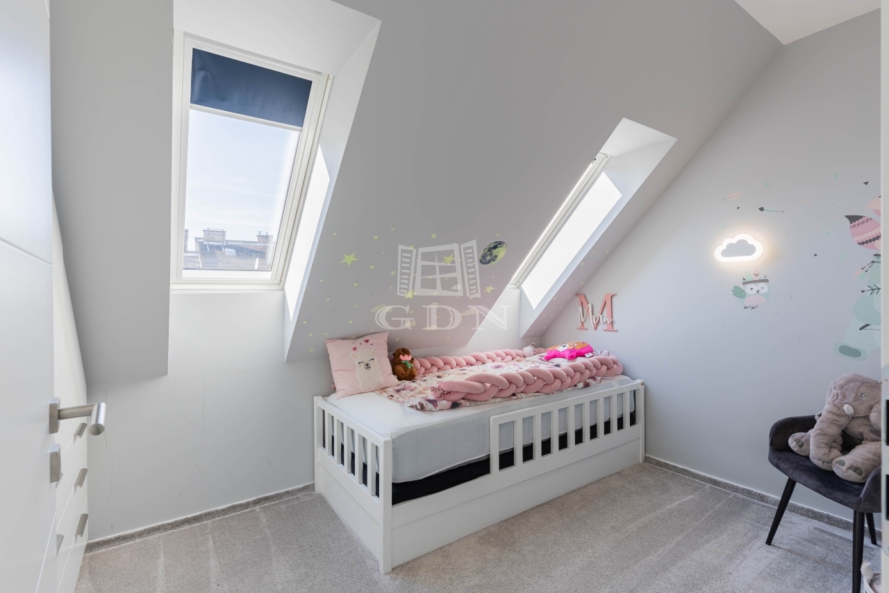 A lakás különlegessége a belső kétszintes kialakítás, amely tágas, jól elkülönülő élettereket biztosít.