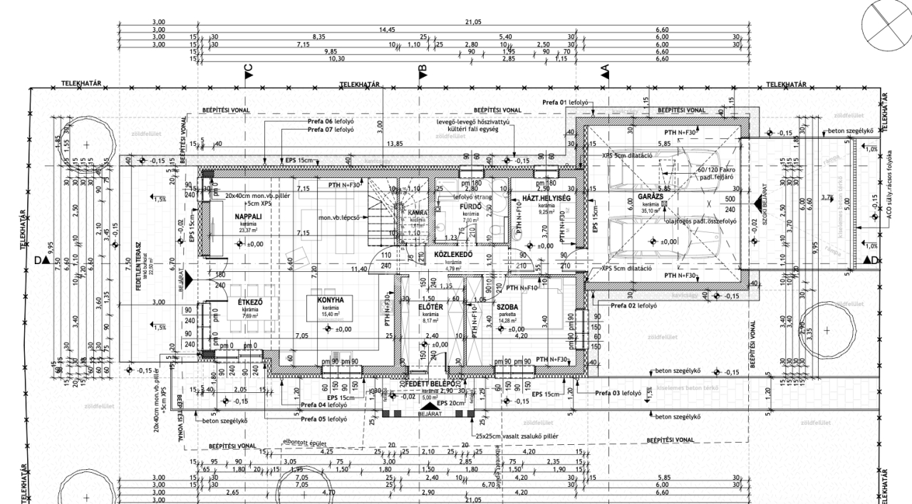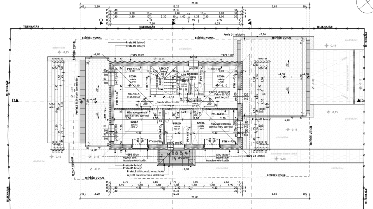 - főfal 15 cm EPS, aljzatban 12 cm, födémen 25 cm szigetelés