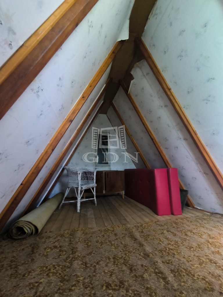 Nógrád zártkerti részén, aszfaltozott út mellett eladó, egy 16 nm alapterületű részben alápincézett, tetőtérbeépítéses, alpesi tetős faház, 821 nm-es telken.