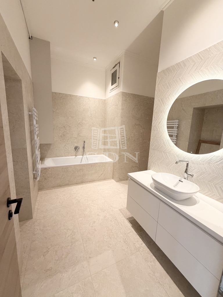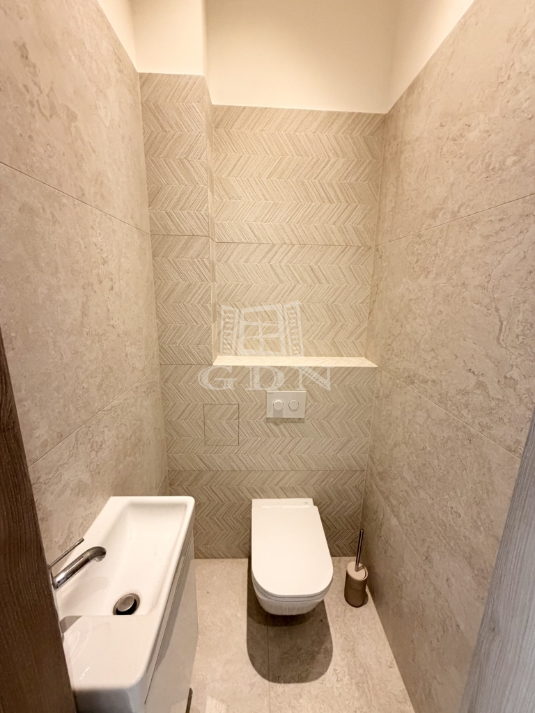 A fürdőszobában zuhanyzó, nagyméretű kád, valamint a mosó- és szárítógép számára kialakított falfülke kapott helyet. A Fürdő és a WC külön helyiségben kapott helyet. Az egész lakás ízlésesen berendezett, és nagyon hangulatos, a tulajdonos eredetileg saját részre újította fel.