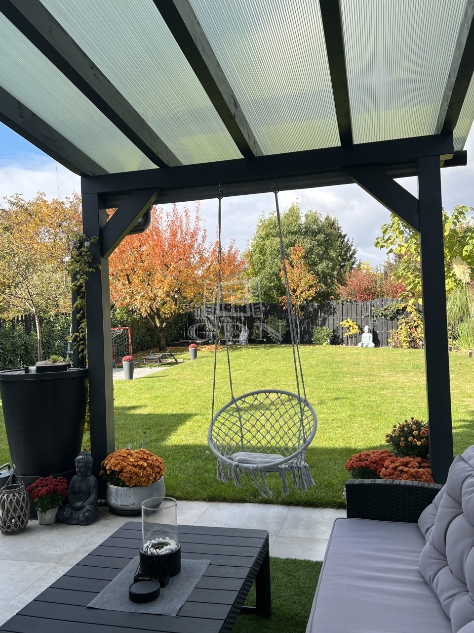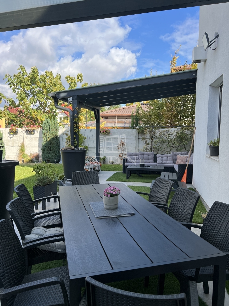 - Nagy terasz fedett részekkel, gyönyörűen parkosított kert