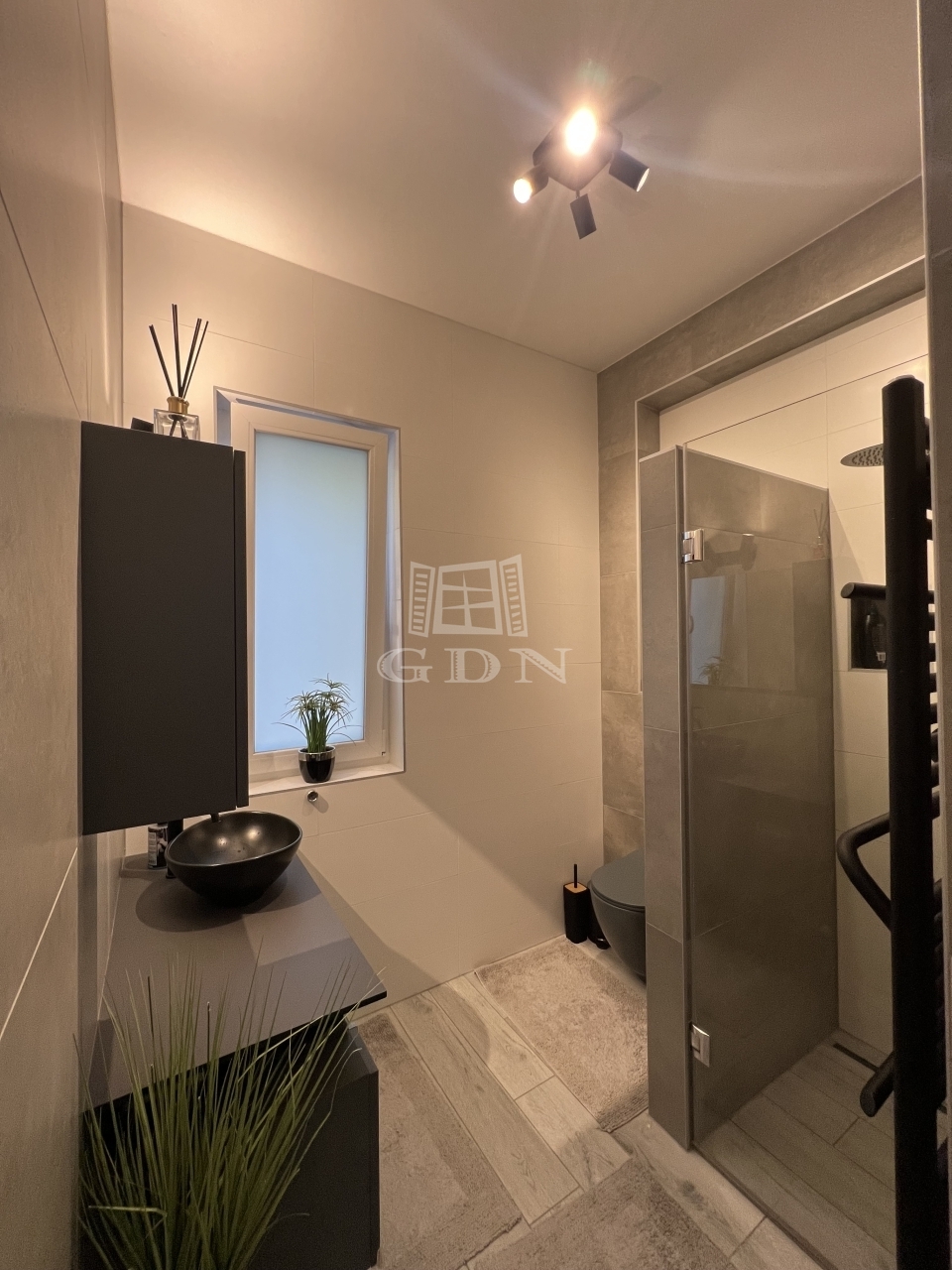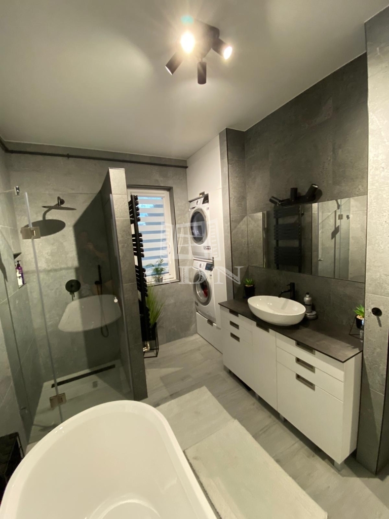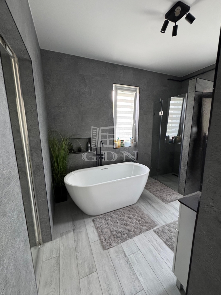 Az alaprajzhoz képest az emeleten a szülői hálószobából egy elegáns tükör tolóajtón keresztül közvetlenül is megközelíthető a fenti fürdőszoba, amely szintén prémium érzetet ad ennek a helyiségnek is.