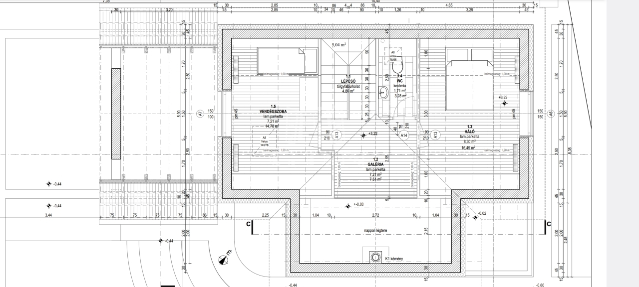 A 100 m²-es lakótér + 16 m²-es fedett terasz egy 400 m²-es telken terül el: két szoba és egy félszoba, külön fürdő és WC, duplakomfort, se felesleges sarkok, se kihasználatlan terek. A nappalihoz kapcsolódó 6 m²-es nyitott terasz nem díszlet, hanem a ház kinyílása, ahol a panoráma és a csend egyszerre ad levegőt a mindennapoknak.
