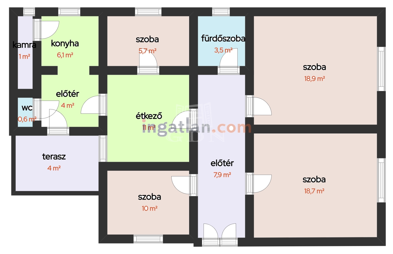 szoba 18,9m2, szoba 18,7m2, szoba 10m2, szoba 5,7m2, étkező 11m2, folyosó 7,88, fürdőszoba 3,5m2, konyha 6,1, előtér 4m2, kamra 1,1m2, toalett 0,6m2;