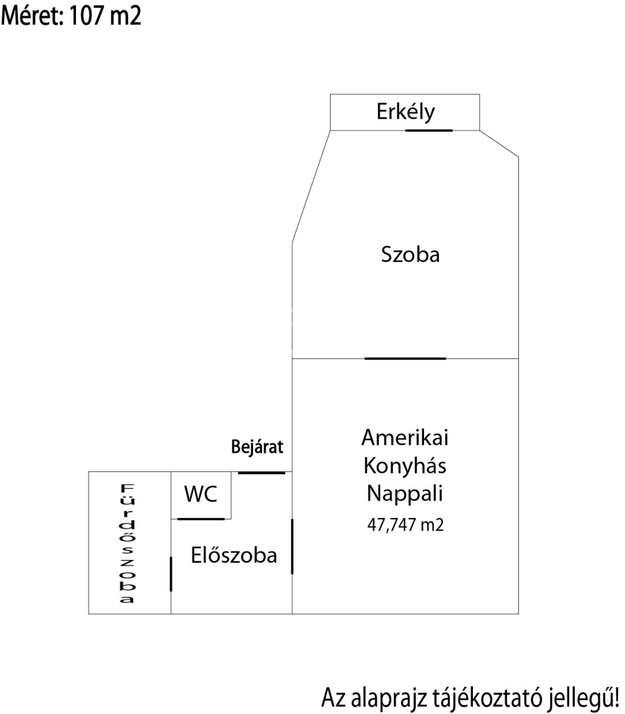 A lakás a második emeleten helyezkedik el, amerikai konyhás nappaliból, hálószobából, előszobából, fürdőszobából és még egy különálló WC-ből áll.