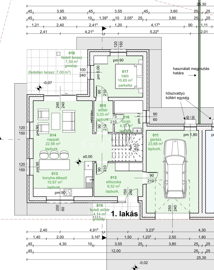 1. lakás: nettó 126 nm alapterület + 24 nm garázs + 19 nm terasz, 509 nm telekterület, 200.000.000 Ft