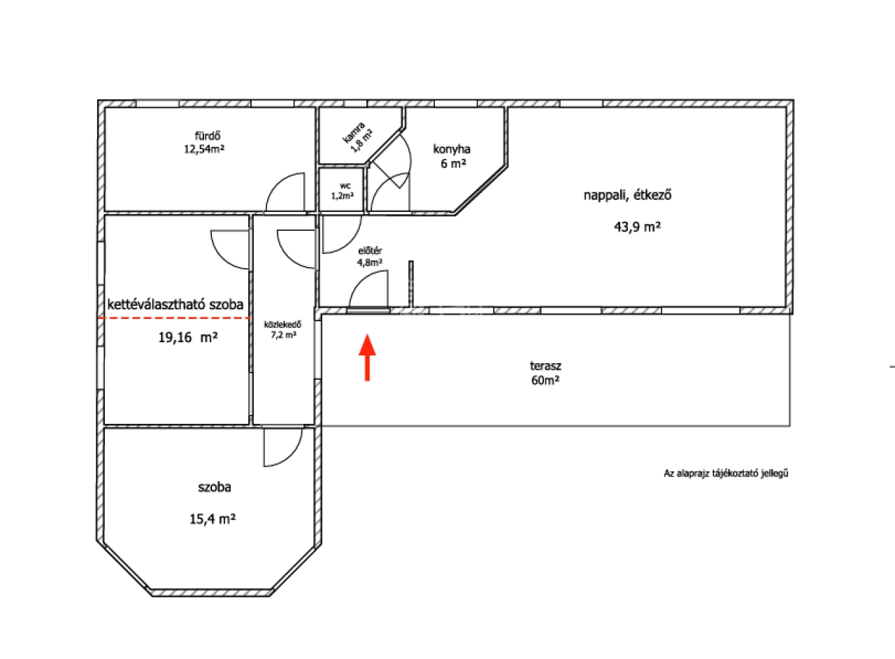Felosztása: amerikai konyhás nappali, 2 hálószoba, előtér, nagy méretű fürdőszoba mosdóval, különálló mosdó, spájz.
