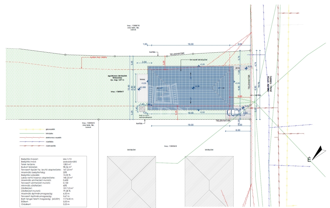 Az épület Porotherm 30-as tégla falazattal, 14 cm-es grafitos homlokzati szigeteléssel és 30 cm vastag tetőszigeteléssel készül. A fűtést és a melegvizet 12 kW-os hőszivattyú biztosítja, a teljes ingatlanban padlófűtéssel, míg a hűtést fancoil egységek látják el.