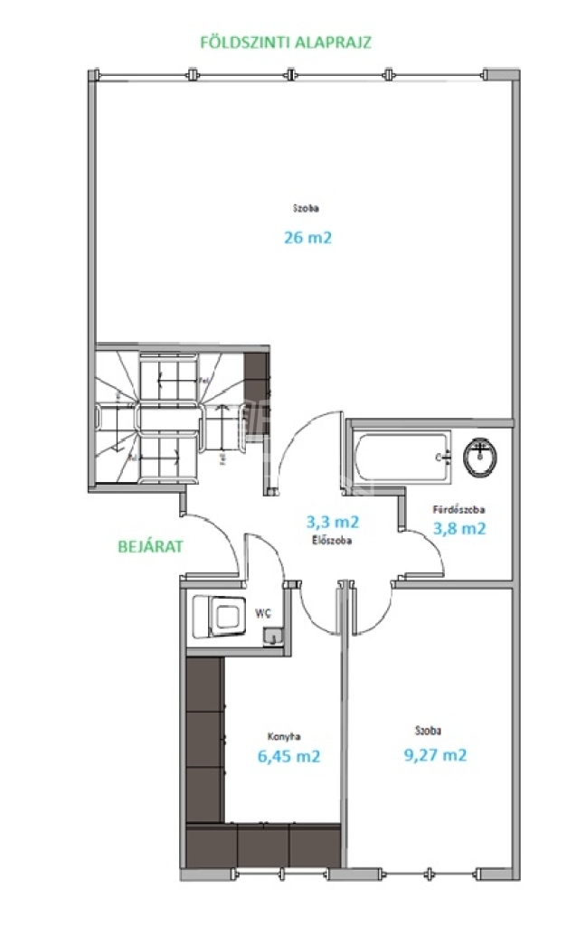 Az alsó szint központja a tágas, 26 m2-es nappali-étkező. Az előtérből nyílik a külön konyha – amely egy kisebb étkezősaroknak is helyet ad –, valamint egy hálószoba, egy fürdő és egy külön WC.
