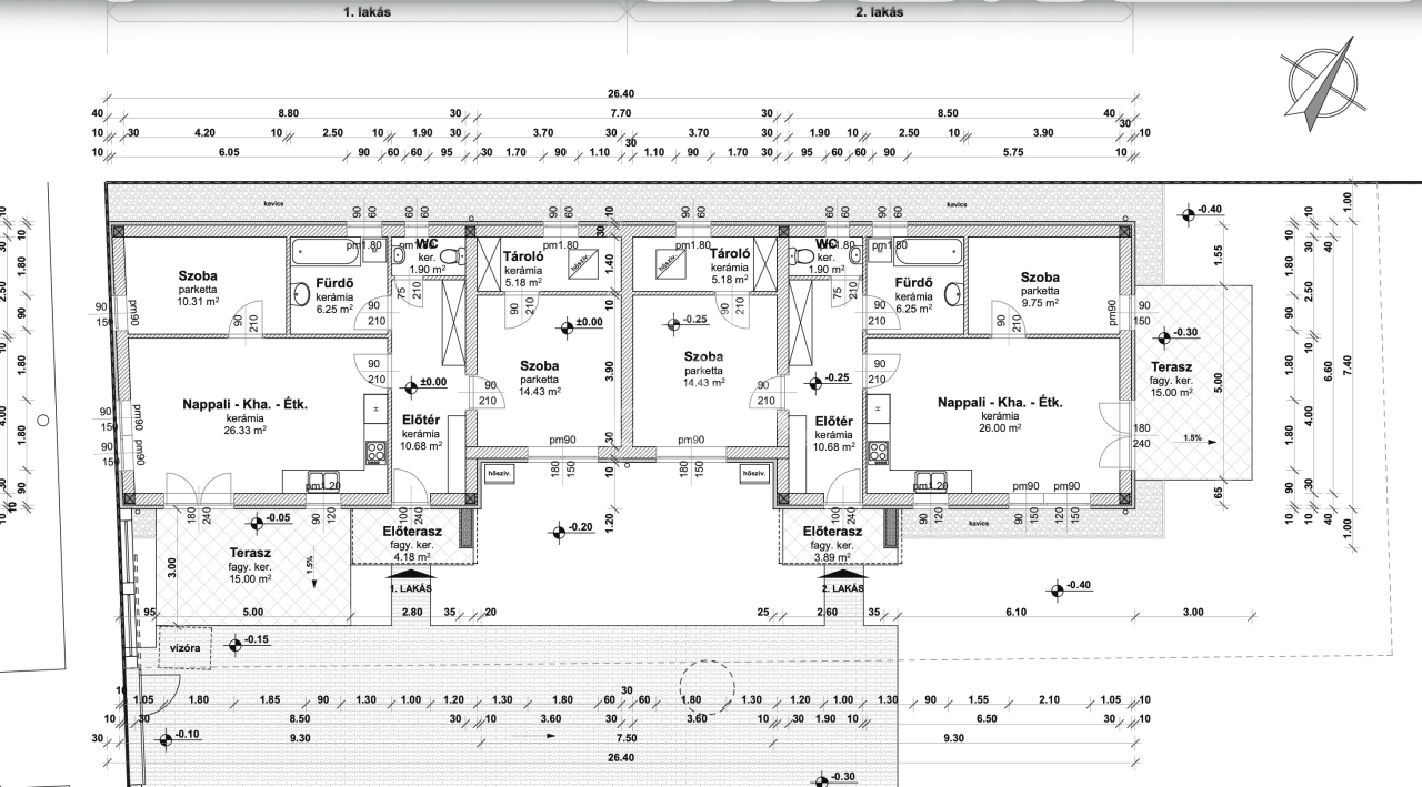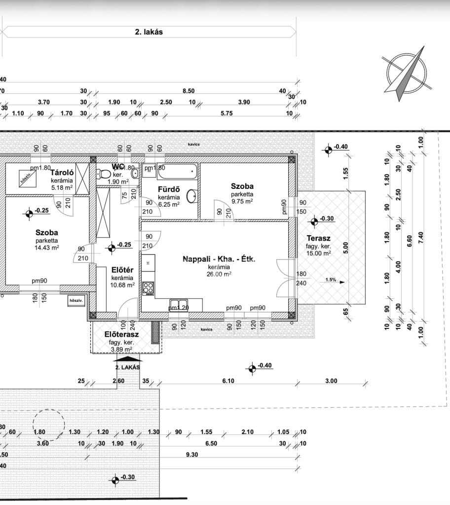 -előszoba(10,68m2), amerikai konyha nappali(26m2), 2 szoba(9,75m2, 14,43m2), fürdőszoba(6,25m2), WC(1,9m2), tároló(5,18m2), valamint 15 m2 és 3,89 m2-es terasz.