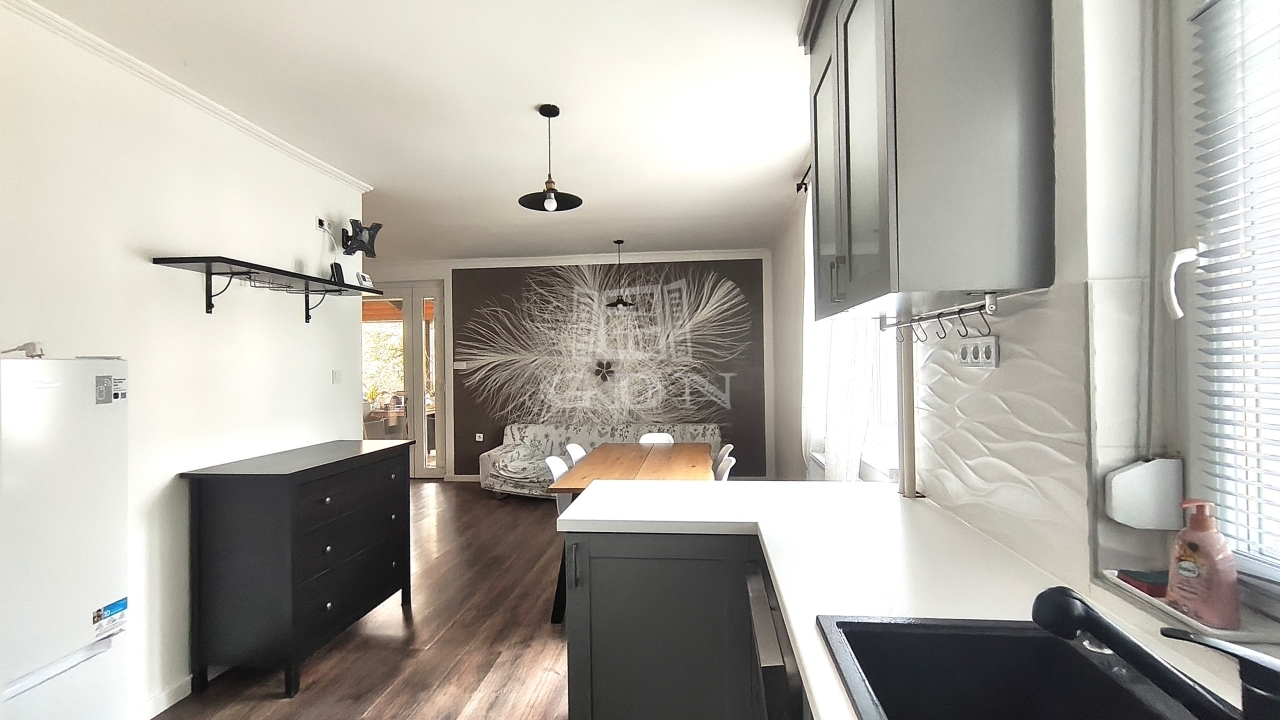 lent nagy nappali, külön szoba, tágas konyha, irodának is használható szoba, A felső szinten több hálószoba amely a családonak kényelmes lesz.