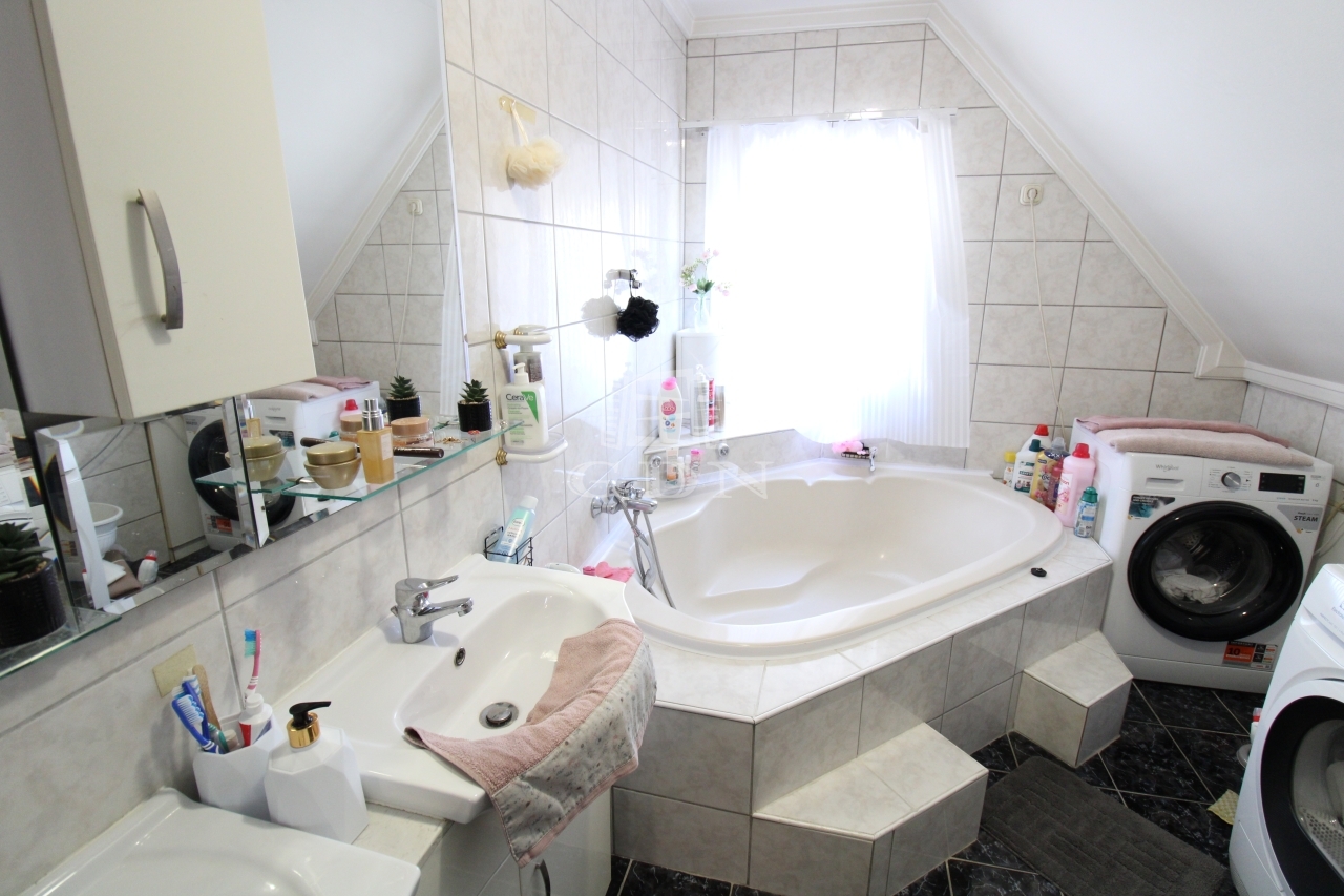 Felső szintre kényelmes fokkiosztású stabil lépcsőn juthatunk fel ahol is kettő félszoba, tágas világos fürdőszoba, illemhely és egy hatalmas amerikai konyhás nappali kapott helyet
