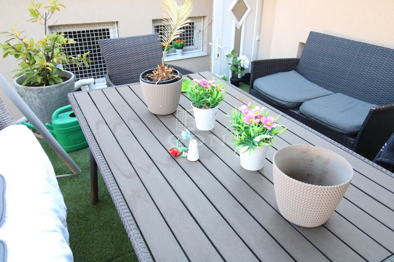 A három bejáratú 100nm nagyságú alsó szinten három szoba, konyha+étkező kettő fürdőszoba és kettő illemhely kapott helyet.