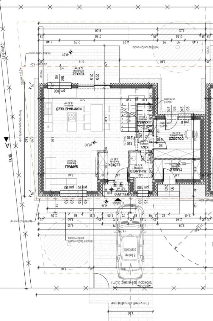 ingatlanonként két gépkocsi számára biztosított, ebből egy parkolóhely a ház előtti területen kialakítható.