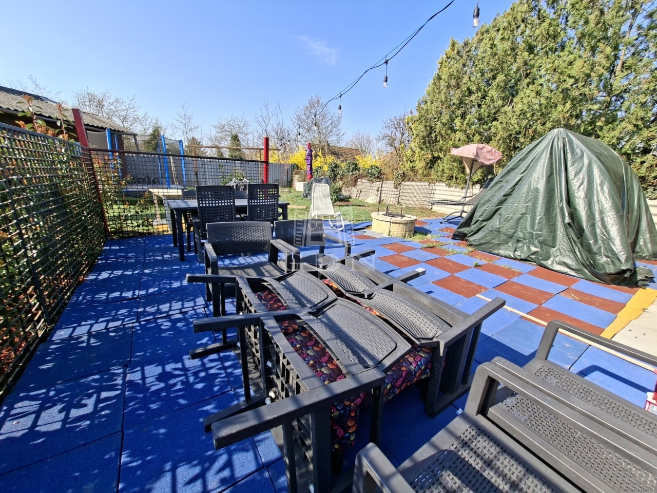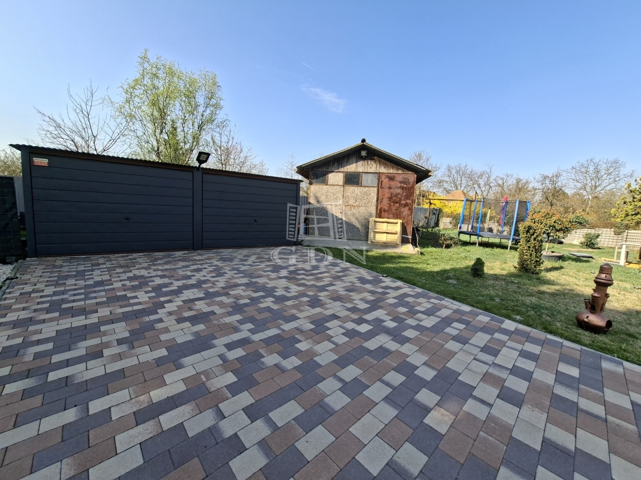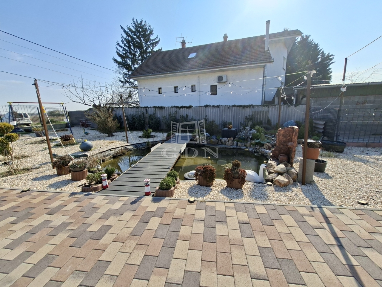 3 garázs, kb 75 nm, kerti tó, viacolorozott kert vezet a garázshoz.
