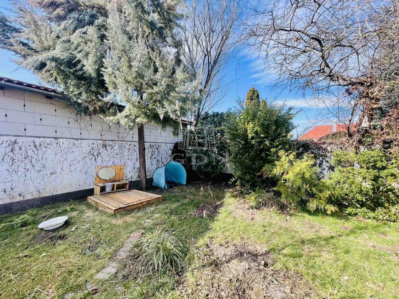 A benne található növényeket (szilvafa, cseresznyefa, égerfa, díszcserjék) fúrt kútról locsolhatjuk.